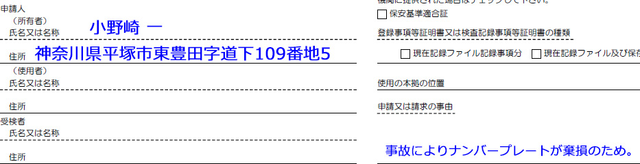 - ■(所有者):氏名及び住所 請求の事理由:「ナンバープレートの破損等」
