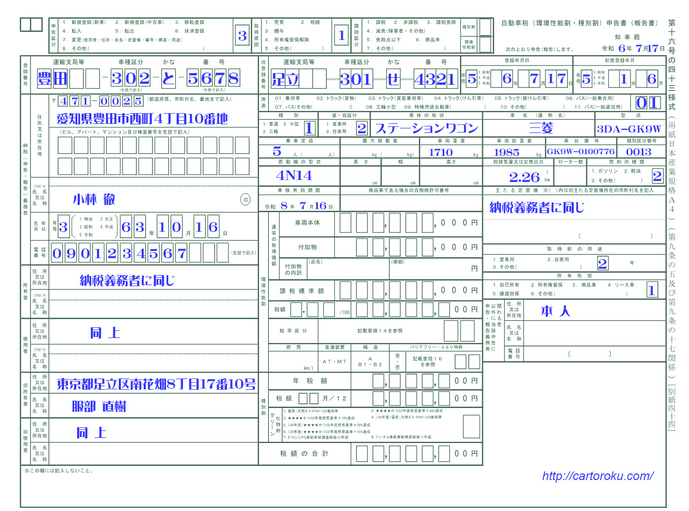 自動車税(環境性能割・種別割)申告書(移転登録)記入例