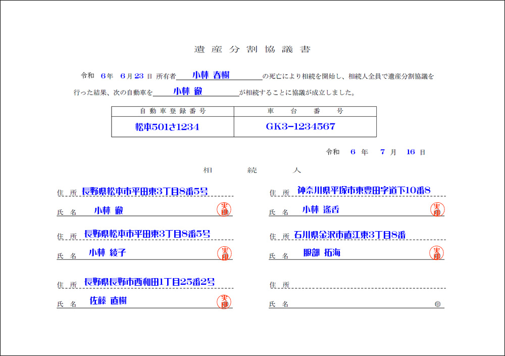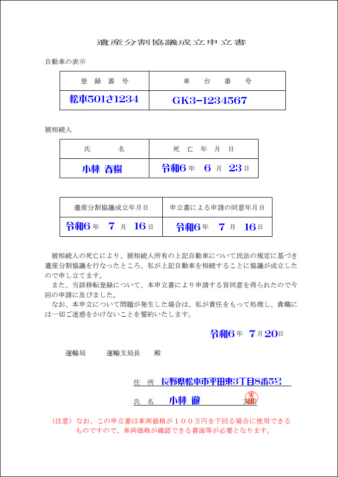 遺産分割協議成立申立書・・・自動車の価格が100万円以下の場合に使用できる。 ※査定証書や査定価格を確認できる資料の写し等が必要。
