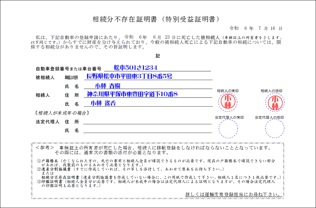 登録手数料印紙500円分を購入して貼付けます。 - 自動車保管場所証明書 ※車検証の使用者の住所と新使用者の住所が違う場合のみ必要