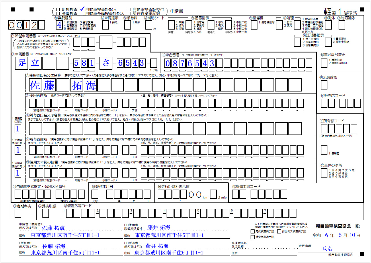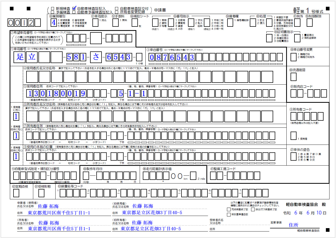 軽自動車の車検証に記載されている使用者住所、氏名に変更があったときの自動車検査証記入申請は、使用者が自動車を使用される本拠の位置を管轄する事務所・支所・分室で手続きして下さい。 軽自動車の住所又は氏名変更の自動車検査証記入申請の手続きに必要な書類と記入方法、費用など記載例を使用して解説しています。