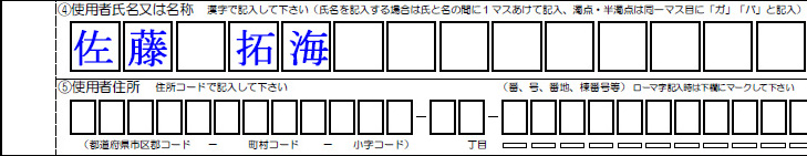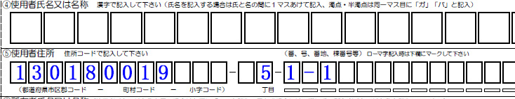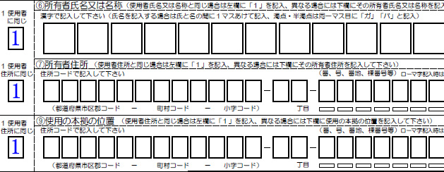 - ■所有者欄(所有者と使用者同一):使用者に同じ「1」使用者住所に同じ「1」 ■使用者の本拠の位置:使用者住所に同じ「1」