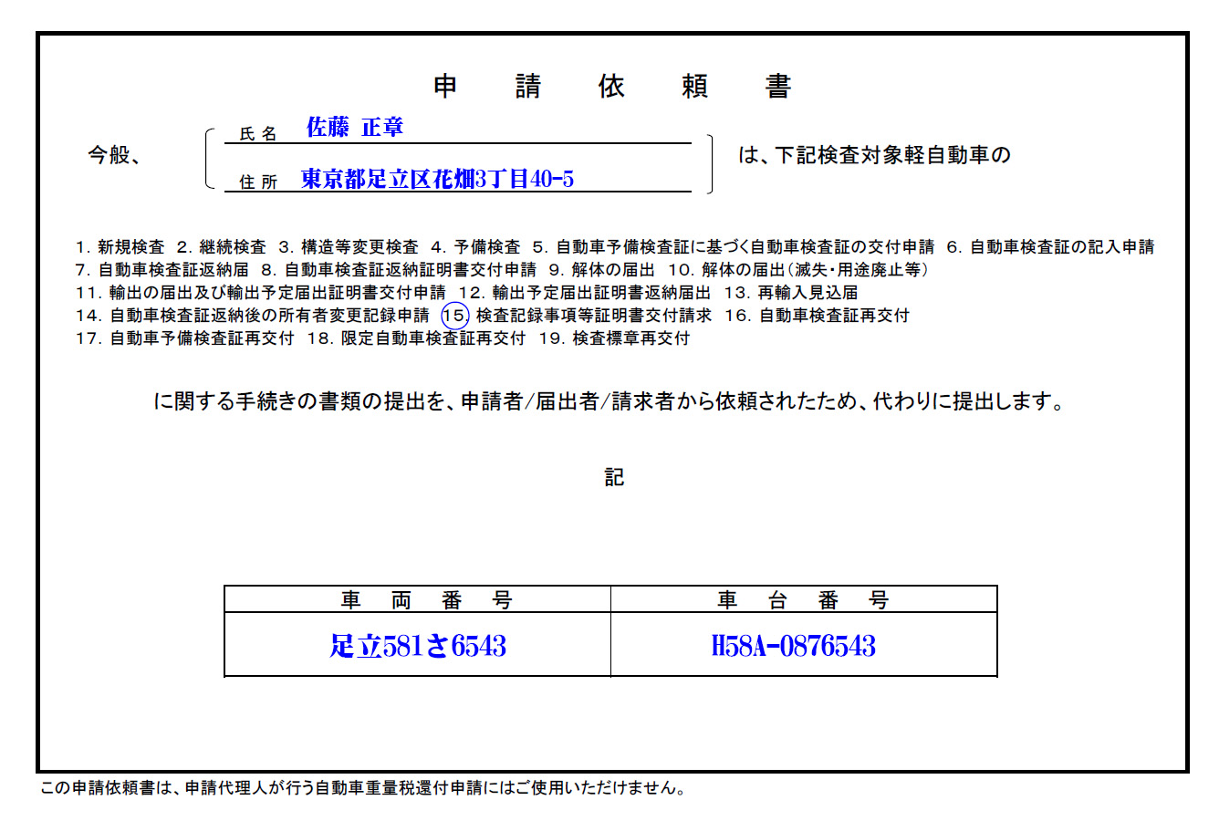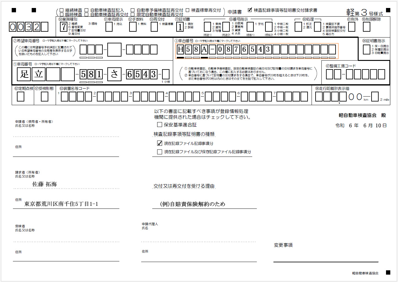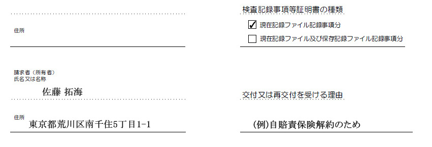 ■請求者(所有者):「氏名及び住所」 ■記録事項等証明書の種類例:現在記録ファイル記録事項分 ■交付又は再交付を受ける理由例:「自賠責保険解約のため」