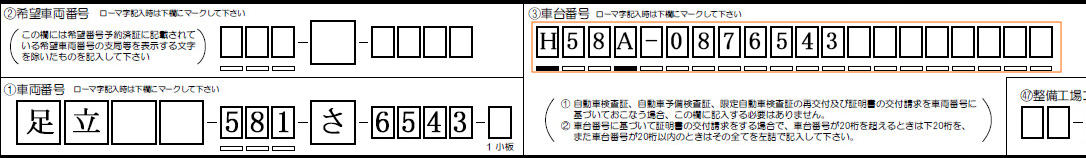 ■自動車検査証返納証明書で確認! 「車両番号」 ※車両番号不明の場合は車台番号「すべての車台番号記入」ローマ字表示には下のマス目に「マーク」