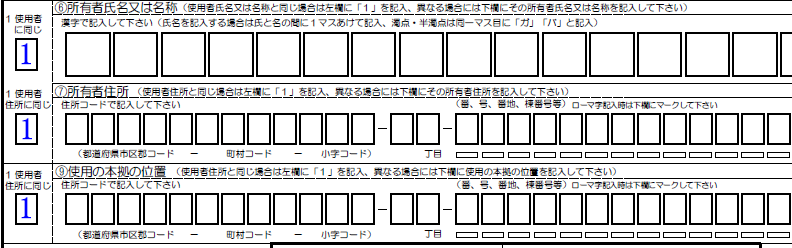 - 所有者欄(所有者と使用者同一):使用者に同じ「1」使用者住所に同じ「1」 ■使用者の本拠の位置:使用者住所に同じ「1」