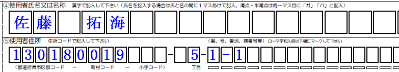 - 「氏名(姓と名の間を一マス空けて記入する)」/住所:コード表示+丁目-番地、番、号など 住所コード検索こちらからどうぞ!!