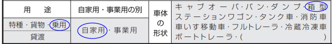 - 用途-自家用・事業用の別-車体の形状: 自動車検査証返納証明書で確認して核当事項「〇」で囲みます。