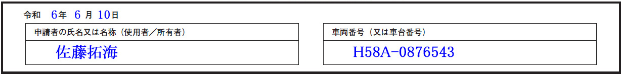 - 申請年月日-申請の人氏名又は名称-車両番号又車両番号(自動車検査証返納証明書で確認して記入します。)