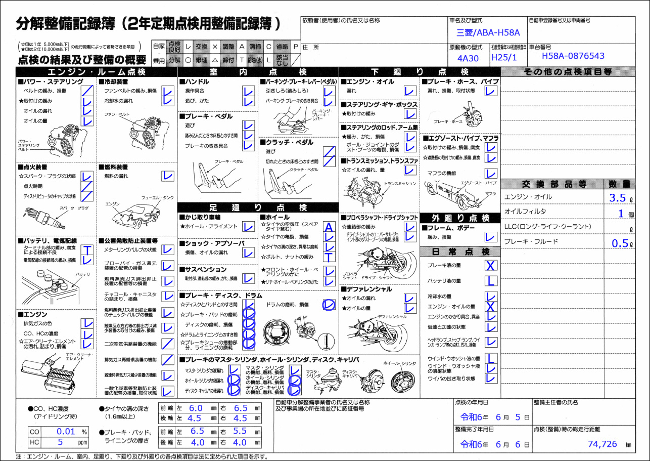 2年定期点検用整備記録簿記入例