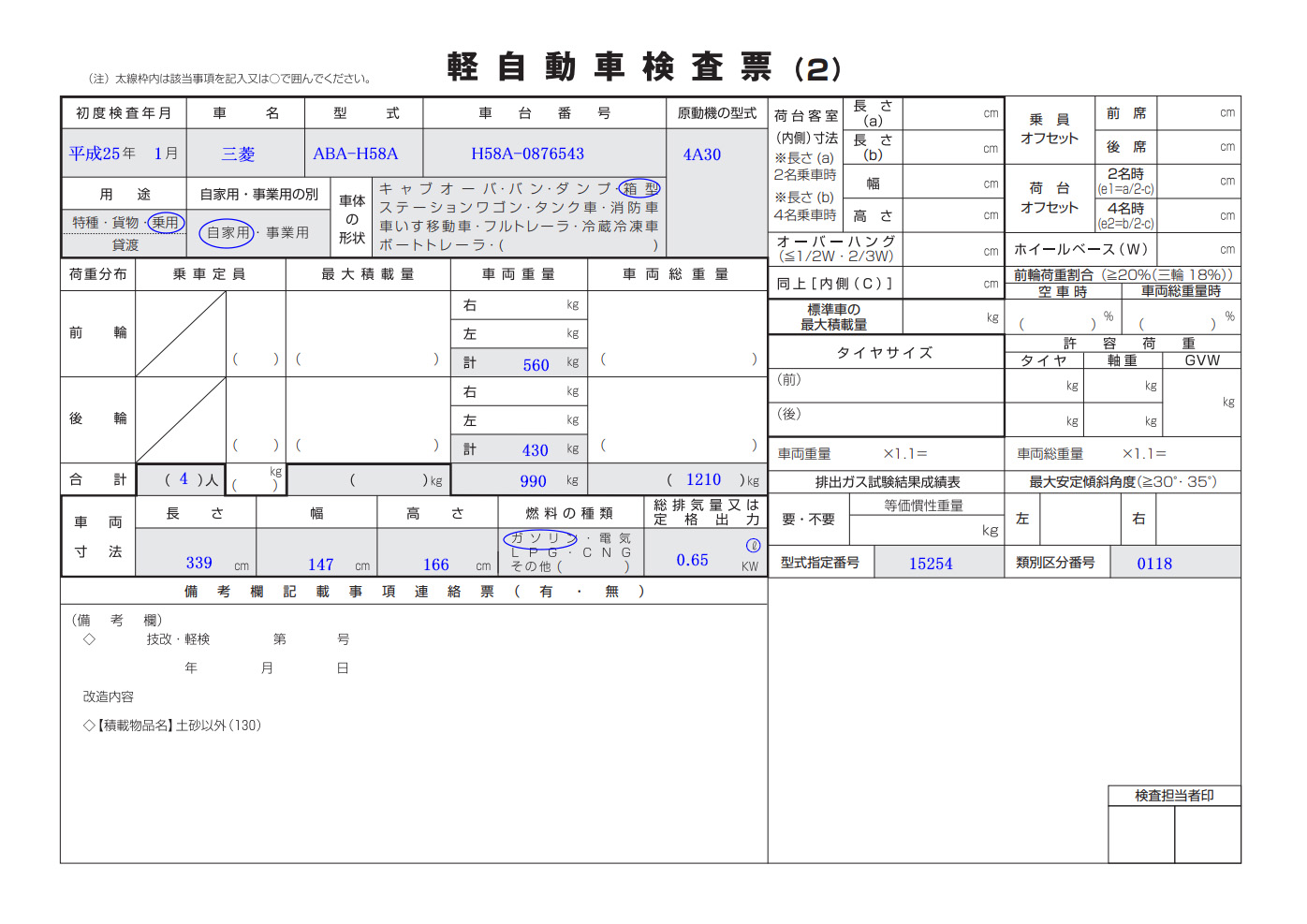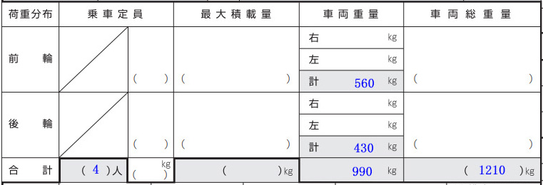 - 荷重分布 乗車定員-前輪重量(前軸重)-後重量(後軸重)-車両重量-車両総重量: 自動車検査証返納証明書で確認して記入します。