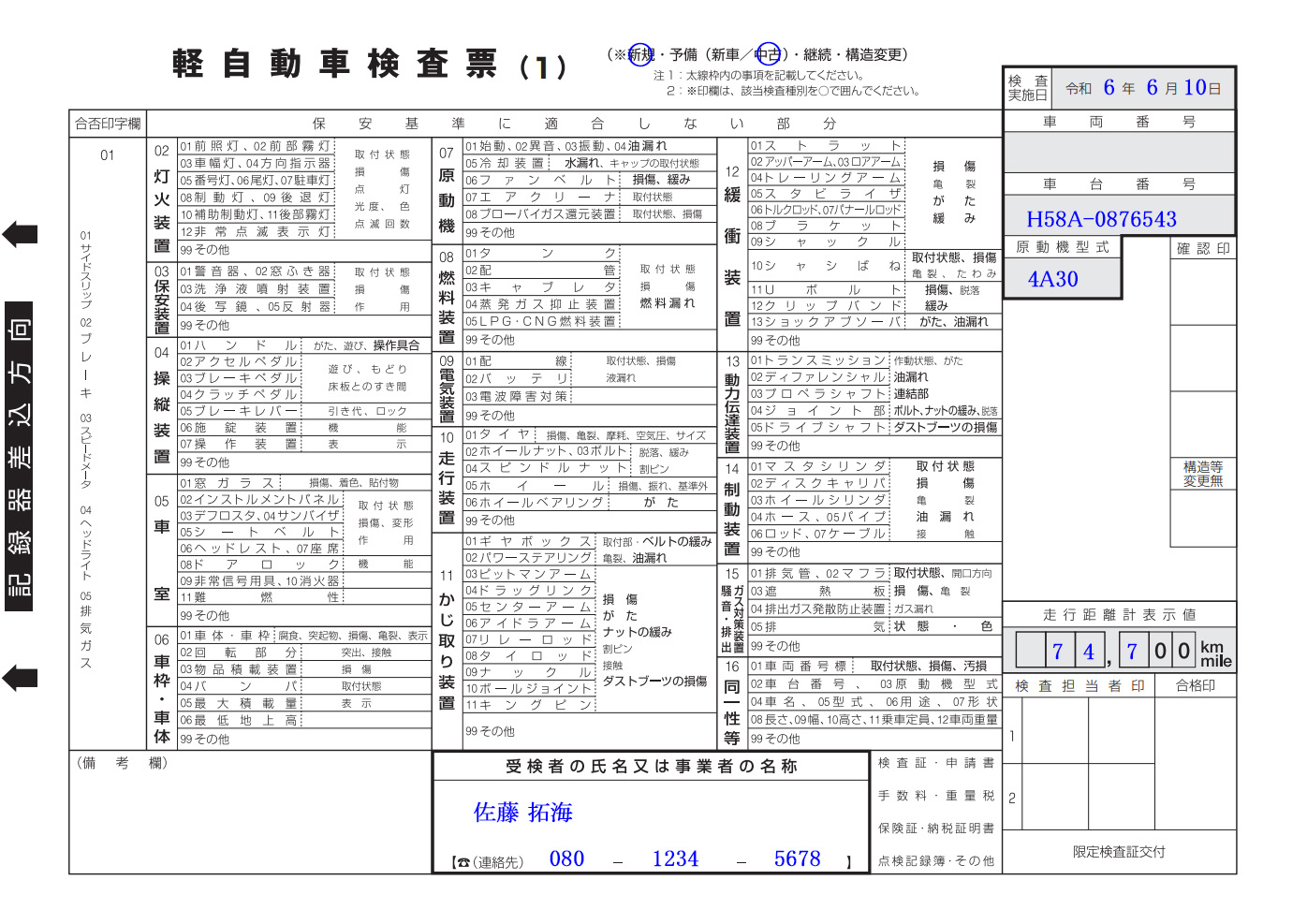 - 走行距離計表示値: 100km以下切捨て74743km⇒「74700km」