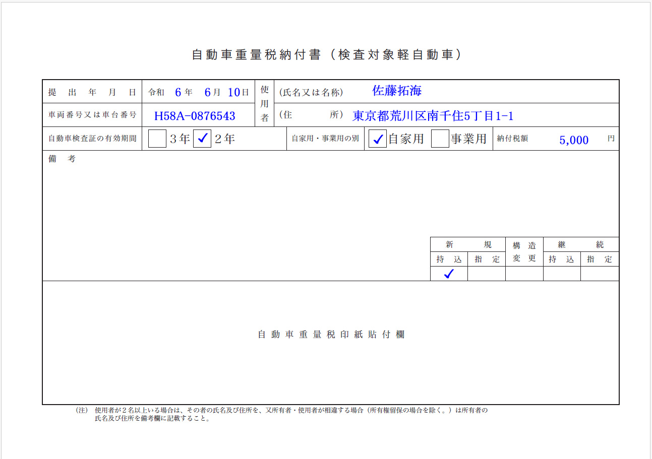 自動車重量税納付書記入例と解説