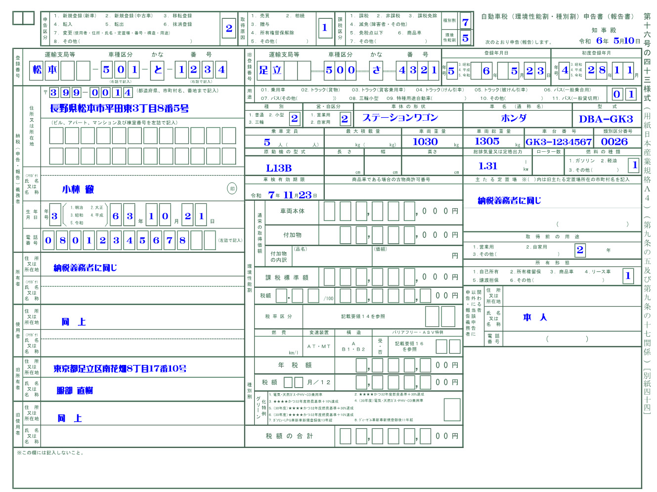 新規登録申請書記入例と解説(所有者と使用者が同一の場合)