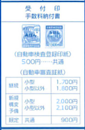 新規持込検査 ・小型車 自動車検査登録印紙 500円 自動車審査証紙 2,000円 ・普通車 自動車検査登録印紙 500円 自動車審査証紙 2,100円