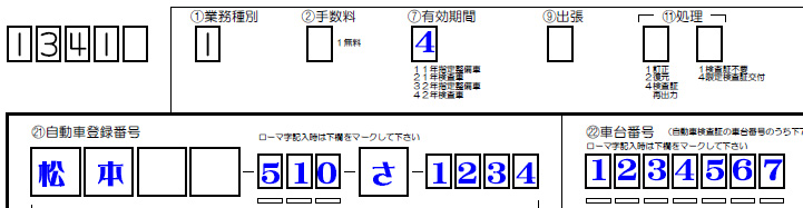 ■有効期間-2年検査車の「4」 自動車登録番号-自動車検査証で確認して記入してください。