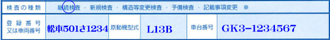■自動車検査証で「登録番号」「原動機の型式」「車台番号」を確認して記入します。